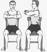 (4)转体运动:平坐在椅子上,双臂抬平,双手交叉,向右转,目视右肘,坚持5秒钟后复原,然后同样的做法向左侧,重复以上动作5次。