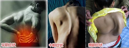 3、晚期症状:腰骶部疼痛加重,脊柱疼痛严重,并伴有全身关节疼痛,疼痛呈持续性不间断性;全身无力、消瘦、肌肉萎缩或部分消失、脏器功能下降;驼背、脊柱活动功能消失,严重畸形弯曲。