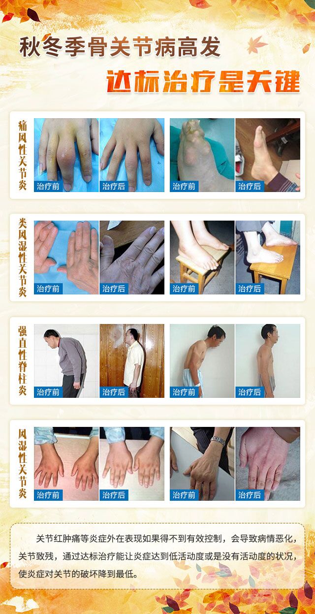 时值秋季,天气逐渐转凉,昼夜温差大,多发骨关节疾病。研究表明,风湿关节疾病易在秋凉时节发病或病症加重,主要的特点是关节的红肿热痛。随着疾病的进展,会发展到关节畸形和功能受限,甚至会影响到身体其他系统的健康。有关研究显示,类风湿性关节炎、强直性脊柱炎等风湿关节疾病其致残率在发病1年内可达20%,10年内可达60%。所以说早诊早治十分必要,而要尽早控制疾病,必须做到达标治疗(即:让疾病达到低活动度或是没有活动度的状况,使疾病对关节的破坏降到低)。