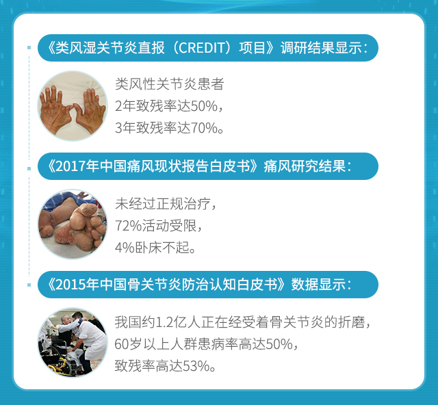 当前,慢性病、意外伤害等导致残疾的风险在显著增加,尤其是以风湿骨关节病为代表的慢性病,成为我国第二大“致残杀手”。据人民网健康卫生频道2015年报道,我国目前约有1.2亿人患有类风湿关节炎、骨关节炎、痛风性关节炎、强直性脊柱炎、反应性关节炎、感染性关节炎、创伤性关节炎等骨关节病,且患病人数不断上升,这些疾病虽并不直接致命,但患者会因长期疼痛而影响生活质量、丧失劳动能力,甚至致残。中华医学会风湿病学分会主任委员、北京协和医院风湿免疫科主任曾小峰教授在前瞻性类风湿关节炎直报(CREDIT)项目的调研结果显示,类风性关节炎患者2年致残率达50%,3年致残率达70%;据《2017年中国痛风现状报告白皮书》新发布我国痛风新研究结果:未经过正规治疗,72%活动受限,4%卧床不起;另外一项数据显示,在50岁以上的人群中,膝骨关节炎的致残率可达53%。