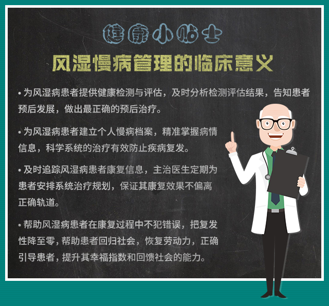 近年来,以风湿免疫病为代表的慢病患病率在全球范围内呈明显上升趋势。在我国,≥15岁人口的慢病患病率由1993年的20.7%增至2013年的33.1%,其中风湿免疫病的患病率仅次于循环系统疾病和内分泌代谢性疾病,位列第三。风湿免疫病给患者带来极大痛苦的同时,也成为影响社会经济发展的严重公共卫生问题。随着我国人均寿命的延长和人口老年化加剧,预期风湿免疫病的患病率还会进一步增高。近年来在我国风湿病学者的不懈努力下,风湿免疫病的规范化诊治水平不断提高。相对而言,对疾病诊断与治疗方案实施过程的管理和长期预后干预的重视还不足。由于缺乏对患者基本医疗知识和生活指导的教育,导致患者依从性差,治疗方案违背,终未能控制病情,甚至由于不当停药导致疾病复发。我院作为风湿病专科医院针对这一现状率先设置风湿慢病管理办公室,加强对风湿免疫病患者的“延伸型慢病管理服务”,使患者的长期预后有显著改善。