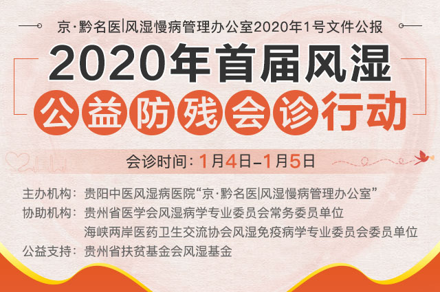 贵阳强直医院“京·黔名医|风湿慢病管理办公室”自2019年9月挂牌成立以来,取得了卓越的成效,为深化开展2020年风湿慢病管理工作,优化服务病人细节,努力为更多风湿病人提供健康帮助、指导,故此发布2020年1号文件公报“2020年首届风湿公益防残会诊行动”,特邀于2020年1月4日-1月5日期间,联合贵州省医学会风湿病学专业委员会常务委员单位、海峡两岸医药卫生协会风湿免疫病学分会委员单位、“京·黔名医|风湿慢病管理办公室”专家成员,共同会诊。