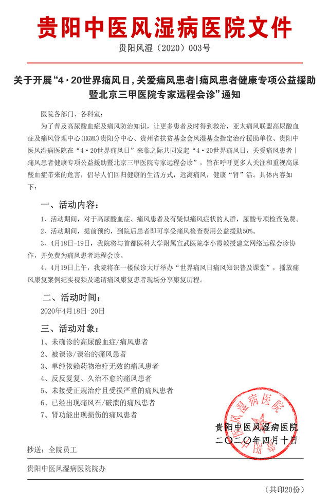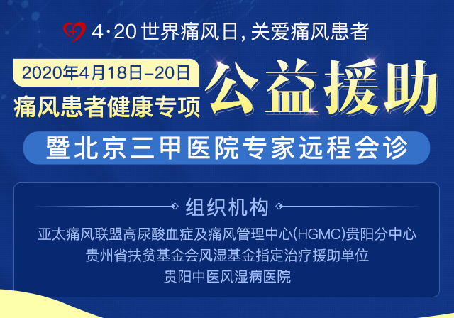 为了普及高尿酸血症及痛风防治知识,让更多患者及时得到救治,亚太痛风联盟高尿酸血症及痛风管理中心(HGMC)贵阳分中心、贵州省扶贫基金会风湿基金指定治疗援助单位、贵阳强直医院在“4·20世界痛风日”来临之际共同发起“4·20世界痛风日,关爱痛风患者丨痛风患者健康专项公益援助暨北京三甲医院专家远程会诊”,旨在呼吁更多人关注和重视高尿酸血症带来的危害,倡导人们回归健康的生活方式,远离痛风,健康“肾”活。