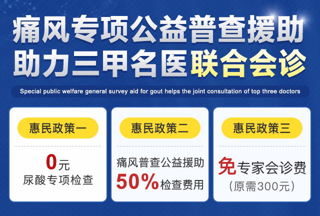 2、痛风普查公益援助50%检查费用活动期间,提前预约,到院后患者即可享受痛风检查费用公益援助50%。
