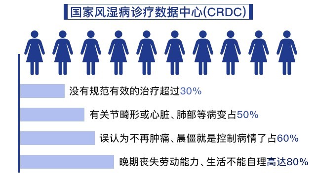 据国家风湿病数据中心(CRDC)统计数据显示:目前我国风湿性疾病的患者约有2亿多人,其中类风湿关节炎有500多万,强直性脊柱炎约有500万,风湿病患者普遍存在知晓率低、就诊率低、治疗率低的“三低状况”;风湿病是一种致残率非常高的慢性疾病,两年致残率达50%,3年致残率达70%;强直性脊柱炎平均3年致残率约为45.5%,5年致残率高达70%以上。风湿病是造成我国人群丧失劳动力和致残的主要病因之一。