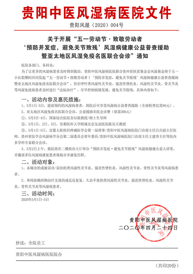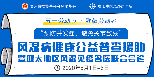 近年来,尽管风湿性疾病的诊断率有所提高,但达标治疗率增长仍不明显,规范治疗率也很低,只有不到44%的风湿病患者得到了比较规范的治疗,为规范风湿病的诊断及治疗,贵阳强直医院联合贵州省扶贫基金会风湿基金将于五一小长假期间共同发起“五一劳动节·致敬劳动者丨‘预防并发症,避免关节致残’风湿病健康公益普查援助暨亚太地区风湿免疫名医联合会诊”,旨在呼吁类风湿性关节炎、强直性脊柱炎、风湿性关节炎、骨关节炎等风湿免疫病患者及时进行“达标治疗”,尽早控制病情发展,避免关节致残