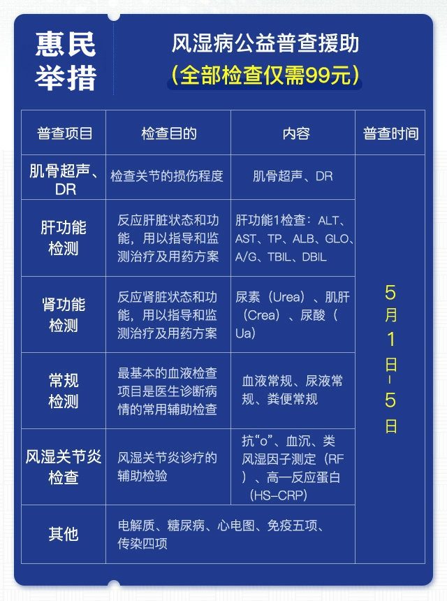 活动期间,提前预约,到院后患者即可享受风湿病检查费用公益检查99元。