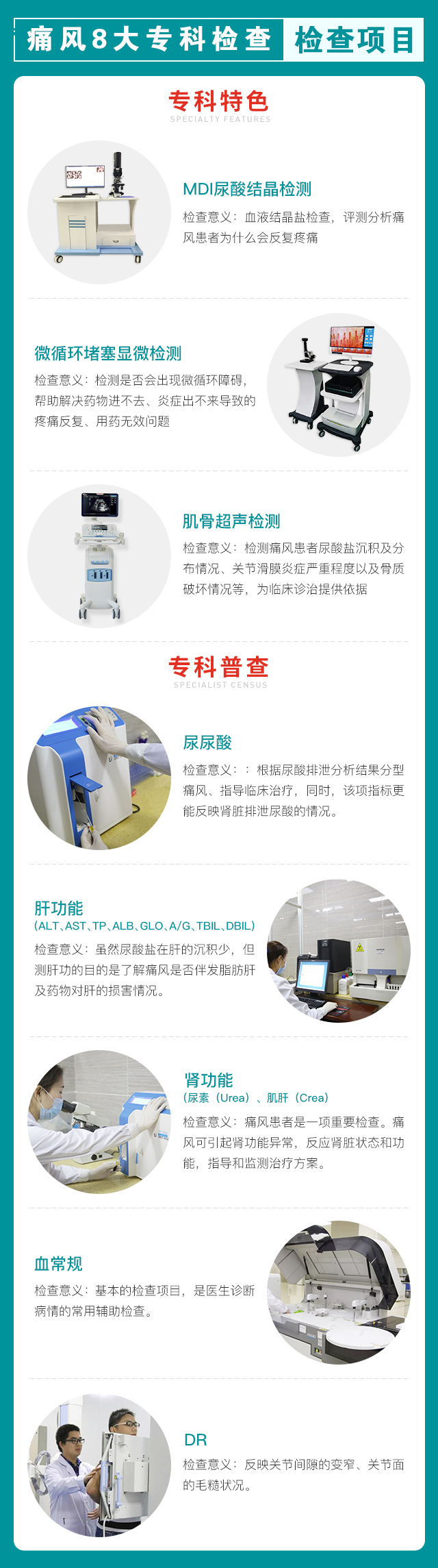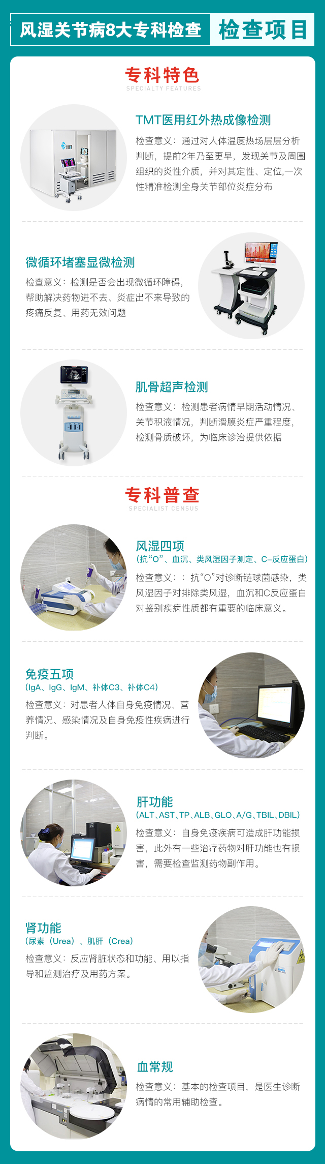 全面专科检查室风湿关节病精准诊疗的第一步关键性前提条件,通过对患者体内免疫状况、代谢障碍问题、关节炎症程度、骨质受损程度及内循环堵塞等进行全面检查,查明病因,为风湿关节病分期分型对症治疗提供有力保障。
