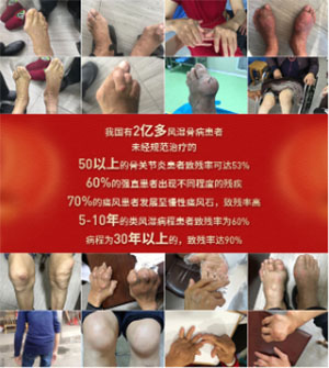 我国风湿骨病患者达2.3亿之多,其中有近8000万人长期以来与拐杖和轮椅为伴。以类风湿关节炎、痛风、强直性脊柱炎、骨关节炎为代表的的风湿骨病患者,普遍存在低知晓率、低就诊率、低治疗率,或是在治疗上存在多种误区导致治疗不规范的情况,这使得疾病得不到及时有效的科学抗复发治疗,终走向关节残疾的悲惨结局......