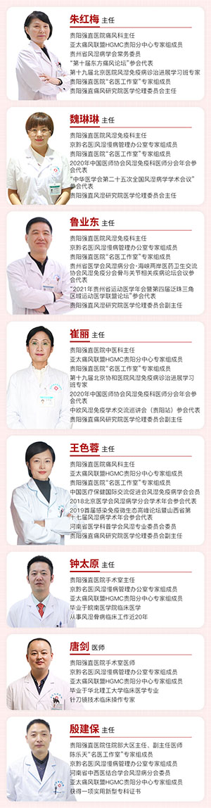 同时,以贵州省医学会风湿病学分会常务委员朱红梅为首的风湿免疫专家团将携手陈乐天教授多对一、多学科会诊,解决你关于类风湿关节炎、痛风、强直性脊柱炎、风湿性关节炎、骨关节炎、腰椎病、颈椎病、滑膜炎、股骨头坏死等风湿骨关节疑难重症问题!